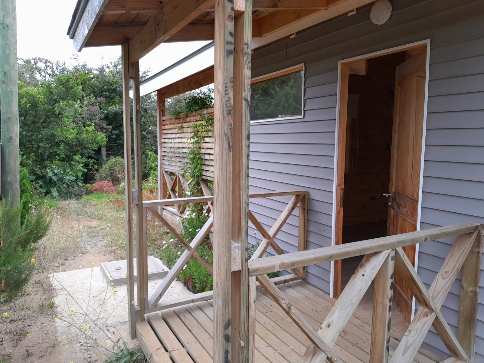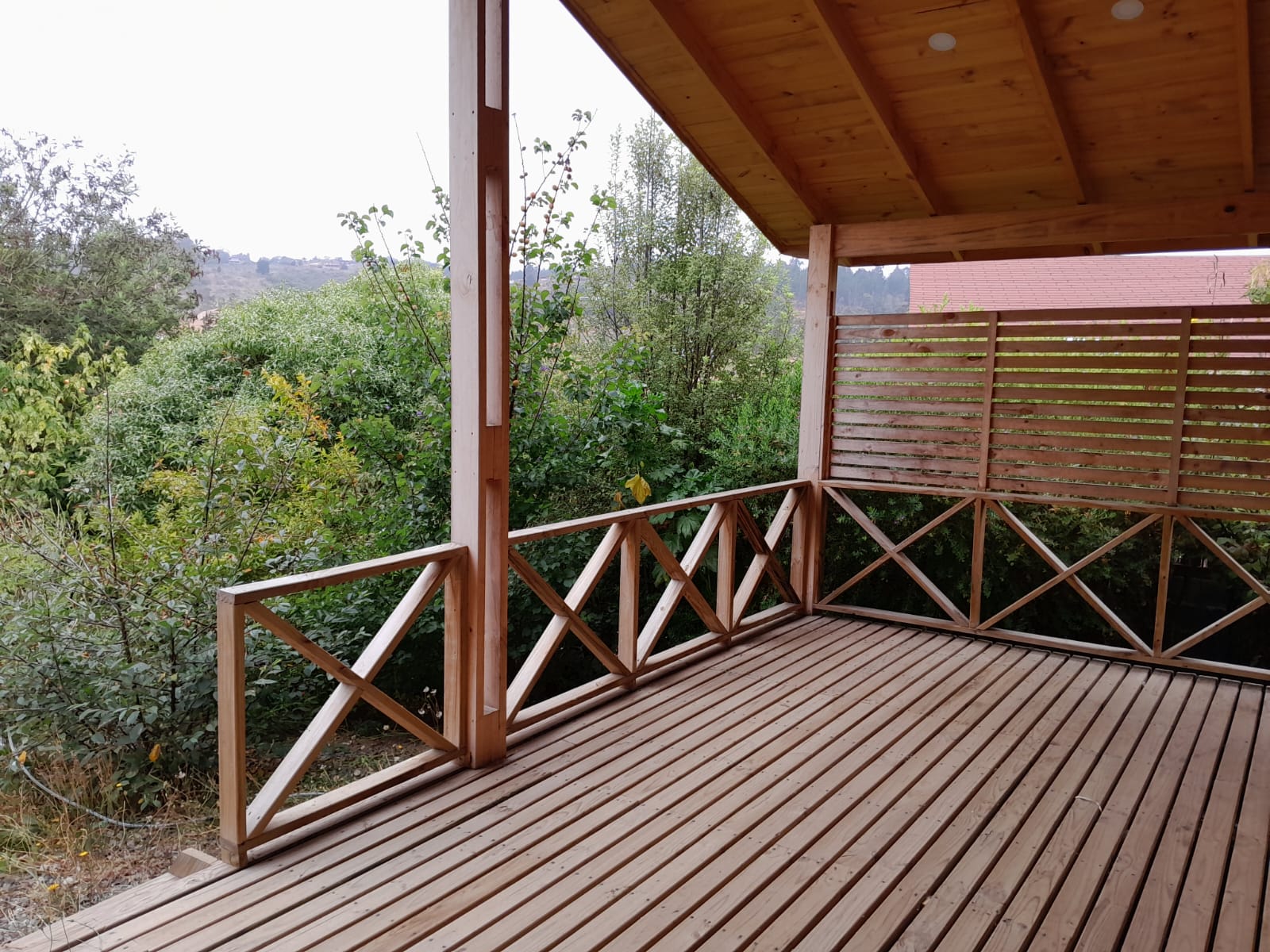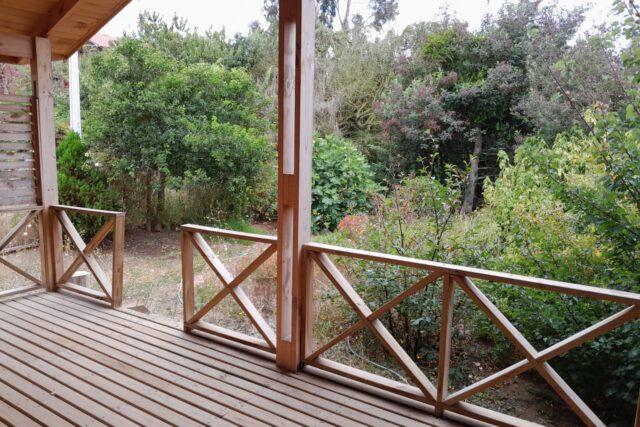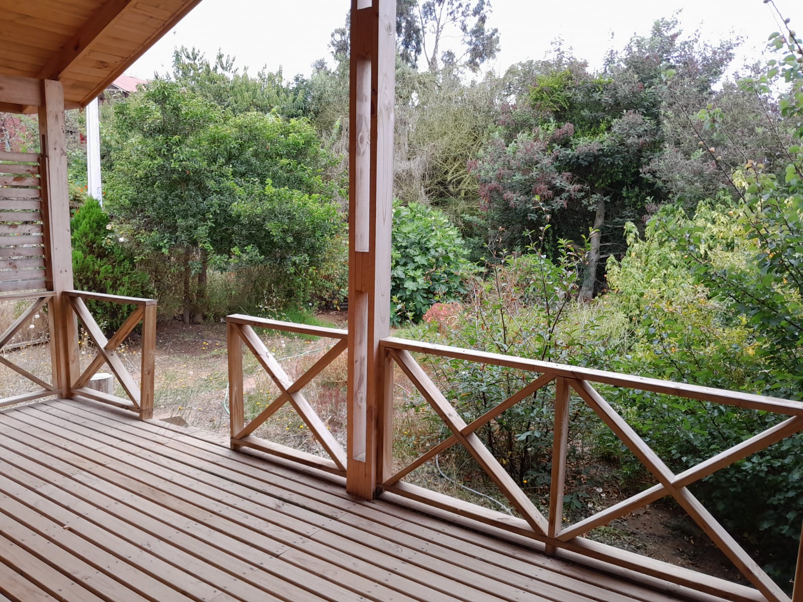 Amplia terraza techada con vista a todos los árboles frutales de la propiedad, estacionamiento para dos vehículos.