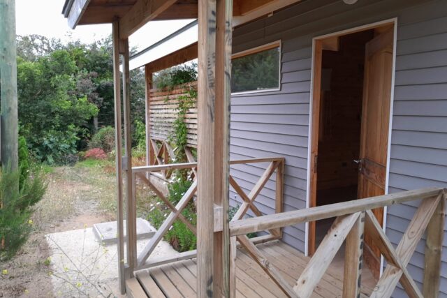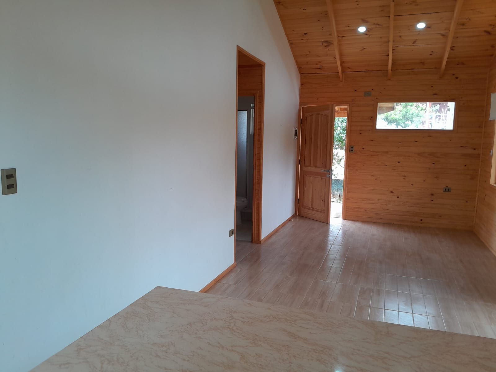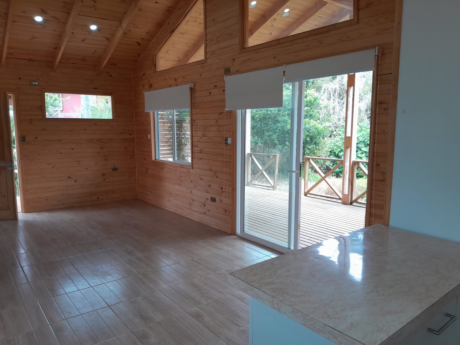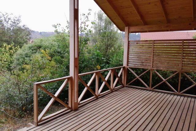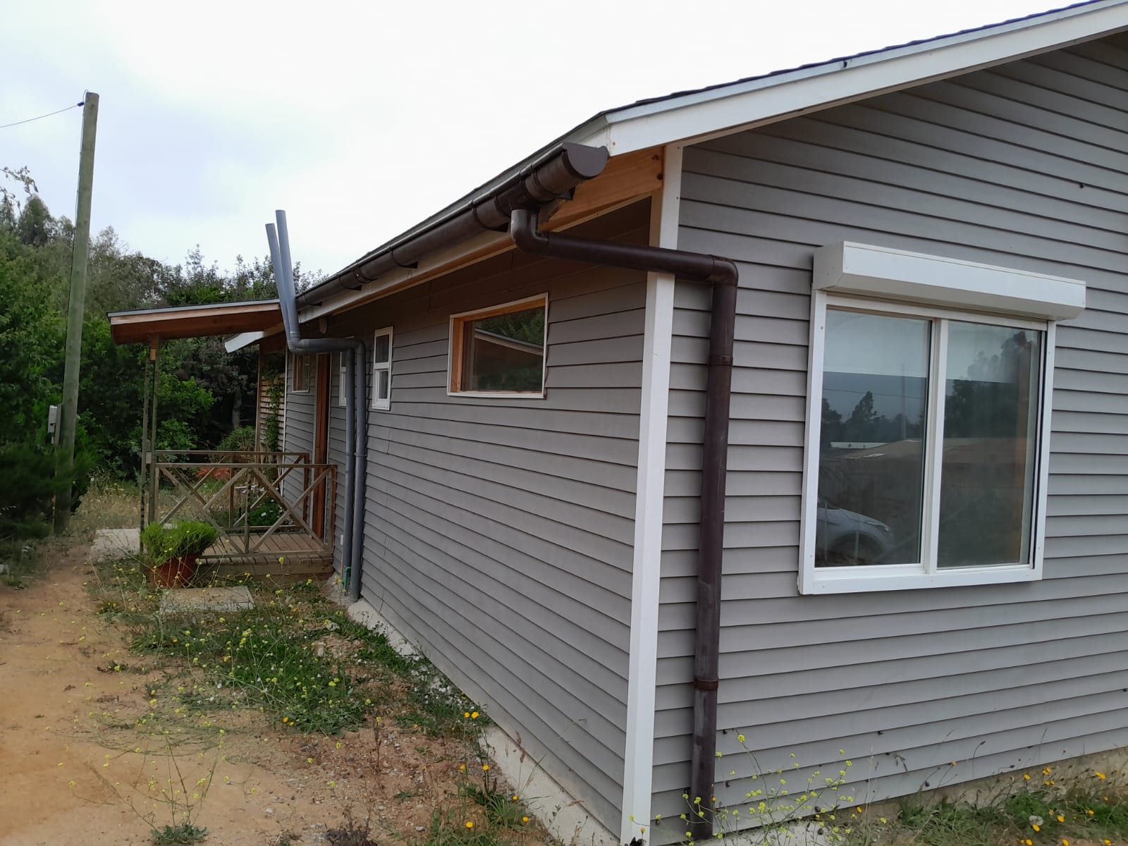 Amplia terraza techada con vista a todos los árboles frutales de la propiedad, estacionamiento para dos vehículos.